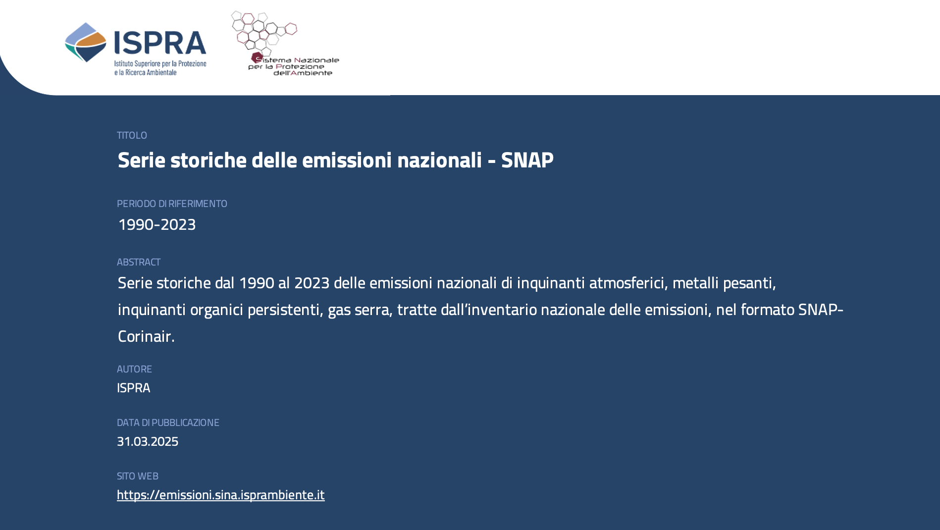 Serie storiche dal 1990 al 2023 delle emissioni nazionali di inquinanti atmosferici, metalli pesanti, inquinanti organici persistenti, gas serra, tratte dall’inventario nazionale delle emissioni, nel formato SNAP-Corinair.