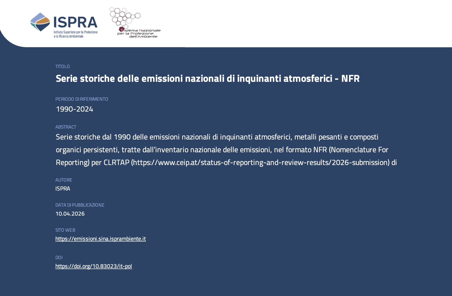 Serie storiche dal 1990 delle emissioni nazionali di inquinanti atmosferici, metalli pesanti e composti organici persistenti, tratte dall’inventario nazionale delle emissioni, nel formato NFR (Nomenclature For Reporting) per CLRTAP (https://www.ceip.at/status-of-reporting-and-review-results/2026-submission) di UNECE.